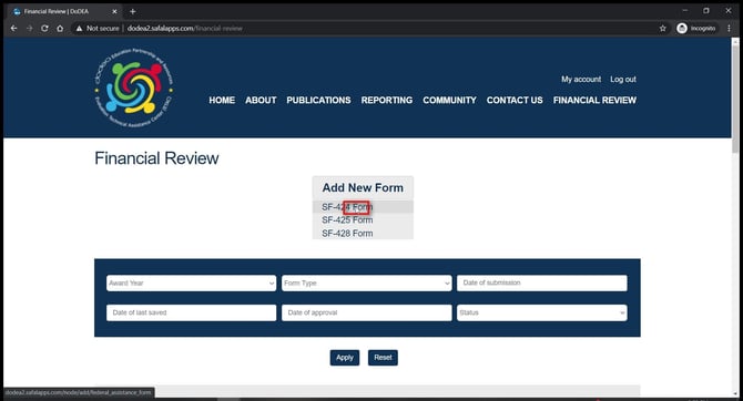 Add New Form: Click the Add New Form button in the top center of the page above the filters. Then select SF-424 Form from the dropdown menu that appears.