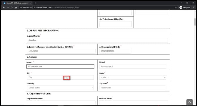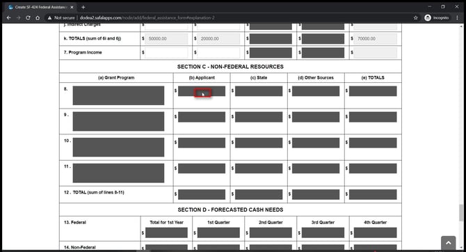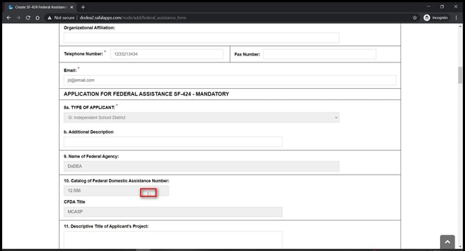 Items 8-10: The Type of Applicant, Additional Description, Name of Federal Agency, and Catalog of Federal Domestic Assistance Number are pre-populated and are not editable.