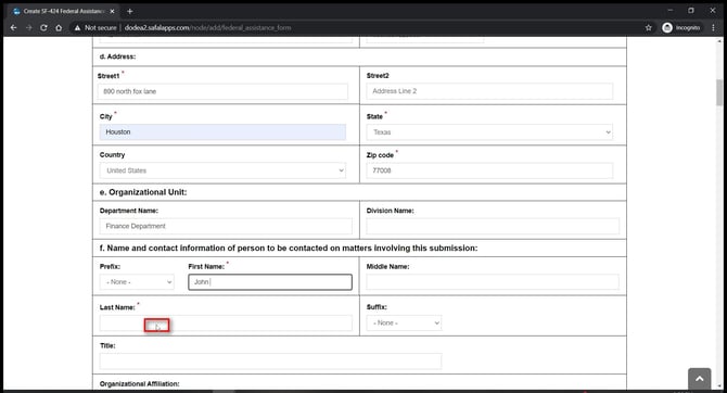 Item 7f: Enter contact information for the appropriate point of contact (Project Director or Finance staff) for the submission.