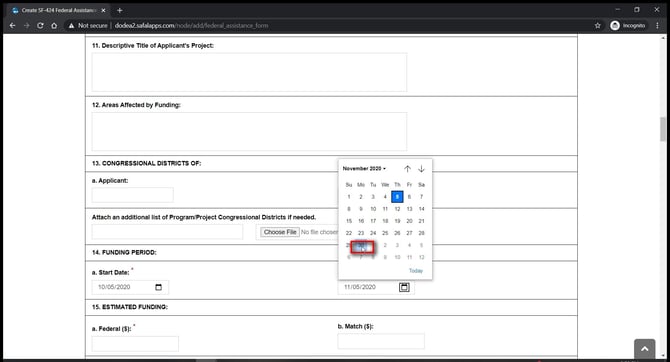 Items 14a-b: Select Funding Period start and end dates from the calendar picker or type them into the box in MM/DD/YYYY format.