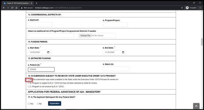 Item 16: For this question, select "a." which reads, "This submission was made available to the State under the Executive Order 12372 Process for review on:." Then, enter the corresponding date in the calendar box that appears when 16a is selected.
