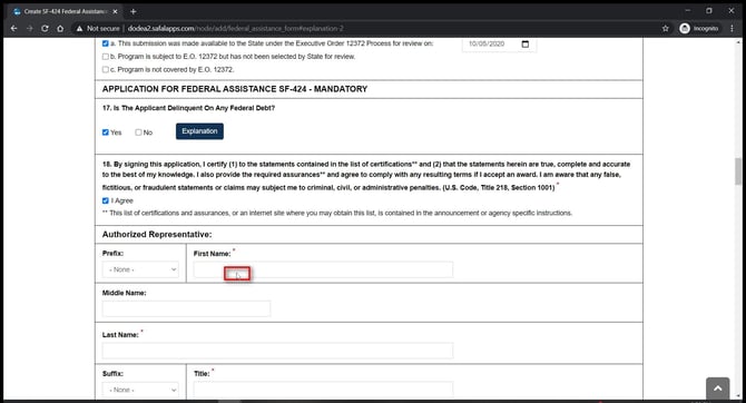 Item 18: To sign the form in your capacity as the Authorized Representative, first read the statement and select I Agree.