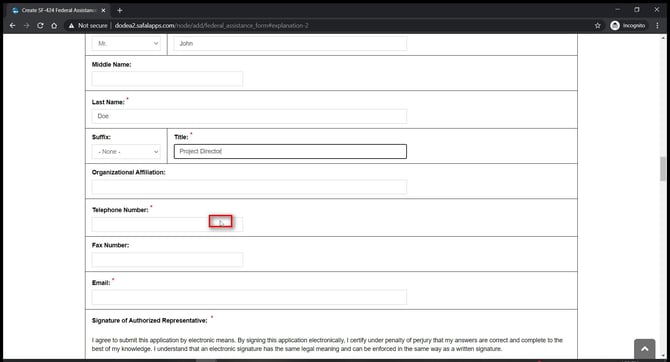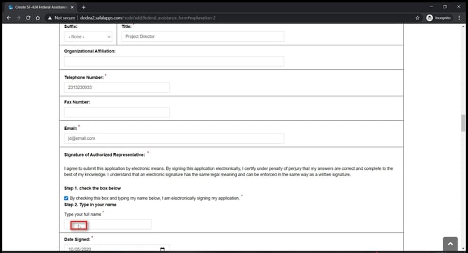 The certification statement reads: "By signing this application, I certify (1) to the the statements contained in the certifications** and (2) that the statements herein are true, complete and accurate to the best of my knowledge. I also provide the required assurances** and agree to comply with any resulting terms if I accept an award. I am aware that any false, fictitious, or fraudulent statements or claims may subject me to criminal, civil, or administrative penalties. (U.S. Code, Title 218, Section 1001)."