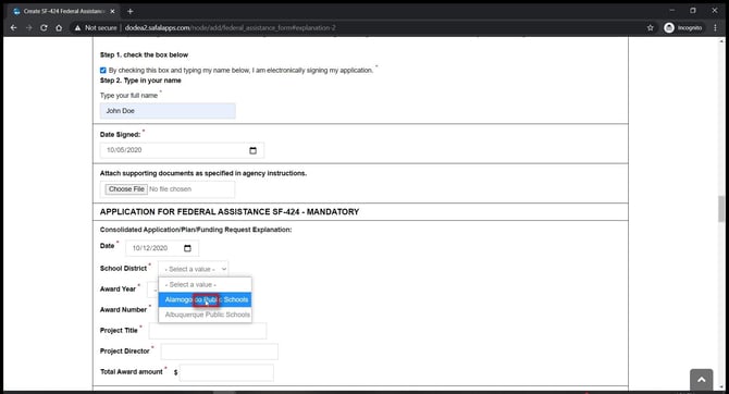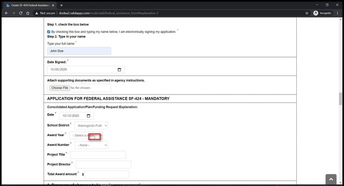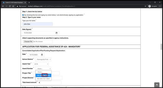 Award Number: Select the appropriate grant award number from the dropdown menu, which is populated based on the selected district. Contact info@dodeagrants.org if your grant award number does not appear as an option.