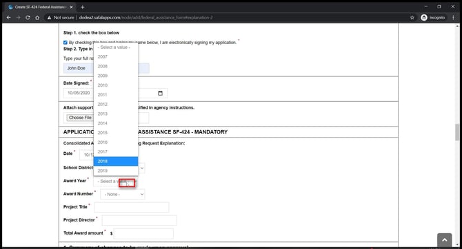 Award Year: Choose the appropriate grant year from the Select a value dropdown menu.