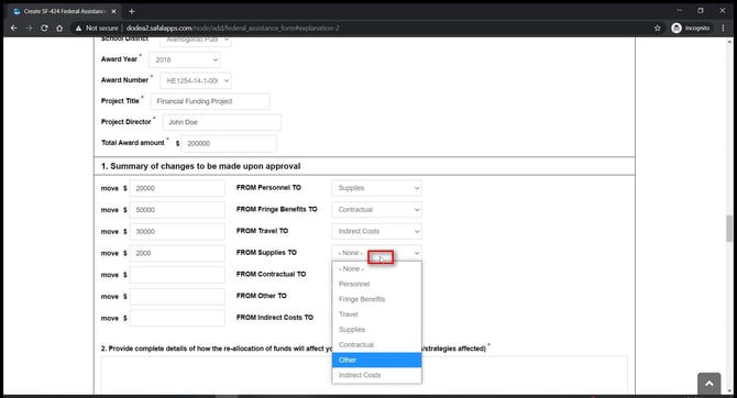 From...To: For each request to move funds from a particular budget category, use the dropdown menu to select the budget category (one of seven options) to which the funds will be moved.