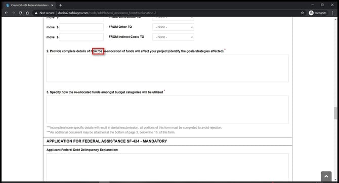Items 11-12: For Descriptive Title of Applicant's Project and Areas Affected by Funding, enter your response in the text field provided.
