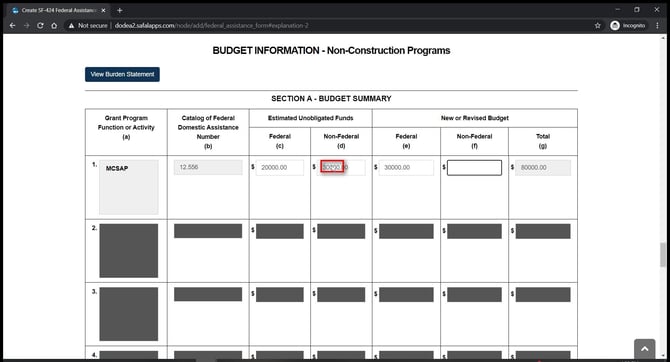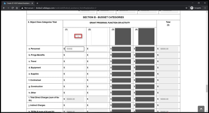 Section A - Budget Summary: Enter budget information in Row 1; this is the only row that is required. Row 5 totals are automatically calculated based on inputs in Row 1.