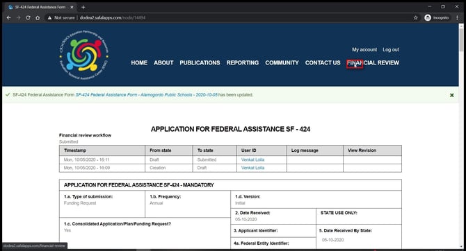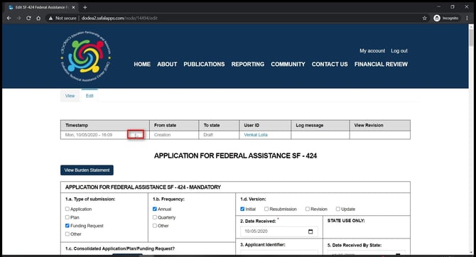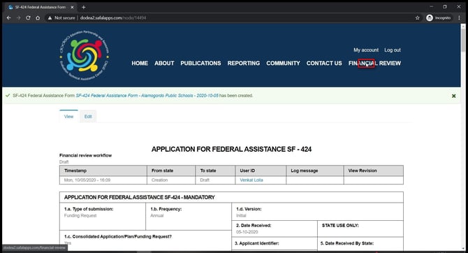 Note: If after reviewing the submitted form, DoDEA Grants staff reject it for any reason, comments explaining the rejection and changes needed for resubmission can be found in the Log Message box in this table.