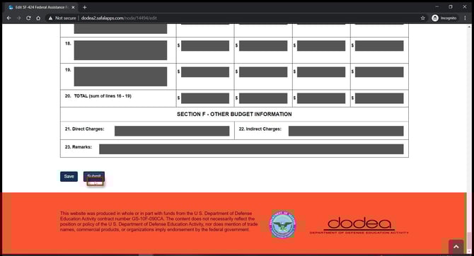 Submit: Click Submit at the bottom left of the page once you have completed the form, checked over your entries, and are ready to send the document to DoDEA Grant Staff for review.
