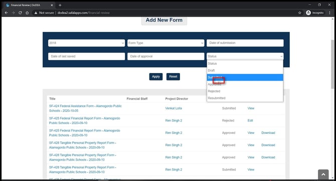 Note: To learn more about using filters to find forms by status, read Navigating the Financial Review Dashboard.
