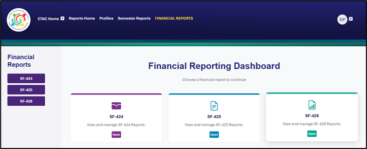 Project directors and financial staff members can create and submit SF-428 forms through the Financial Reporting Dashboard on the DoDEA Evaluation Technical Assistance Center (ETAC) website. Other team members within a grantee school district can view but not edit financial forms. Evaluators do not have access to the Financial Reporting Dashboard.