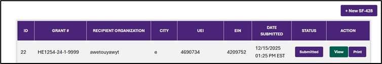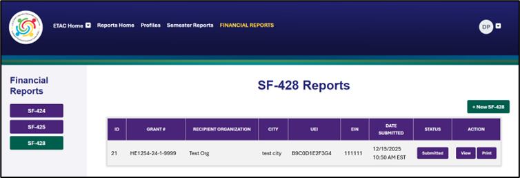 View or Print Your Report: Return to the SF-428 area of the Financial Reporting Dashboard and use the filters to locate your report. Use the corresponding buttons to View the report, or Print a copy for your records.