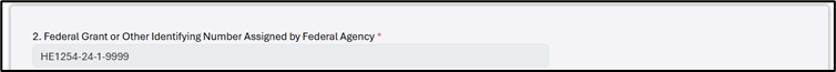 2. Federal Grant or Other Identifying Number Assigned by Federal Agency: Prefilled with the Grant Award Number based on your selections when you created the form.