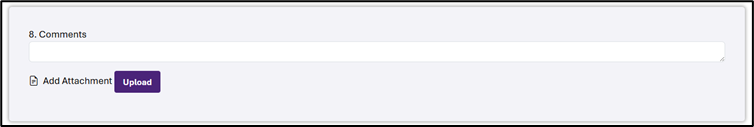 8. Comments and Upload: If needed, enter additional comments in the text field provided and use the Upload button to add your attachments to the form.