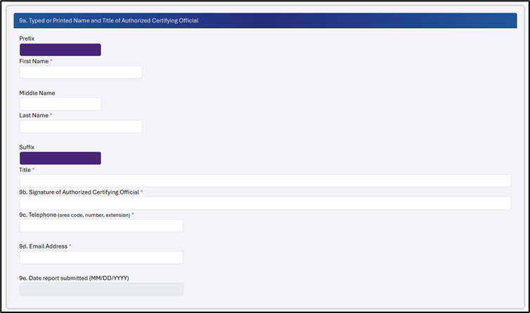9. Electronic Signature: Enter your full legal name, use the drop-down menus to add any prefixes and suffixes, type your signature in line 9.b., and add your contact information in lines 9.c-d. Note that when you submit the form, the submission date will be added automatically to line 9.e.