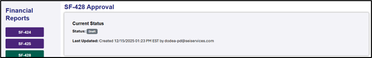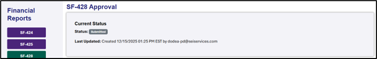 Check Report Status: The submitter will receive an email notification when the DoDEA program team either approves or rejects the submitted report. To view details about the status change, use the filters in the SF-428 area of the Financial Reporting Dashboard to locate the report. Then, click on the Status button (Submitted, Approved, Rejected, etc.) to view the Status History table.