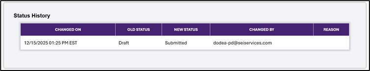 Status History: After you click Submit for Approval, the status history will update with the timestamp of your submission, the new status, and the person who made the change. A new Timestamp row appears for each new status through which the form passes (Draft, Submitted, Rejected, Resubmitted, etc.).