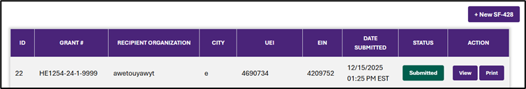 - Select the +New SF-428 button in the upper right to start a new report. To edit an existing SF-428 draft, find the desired form in the table and select Edit.